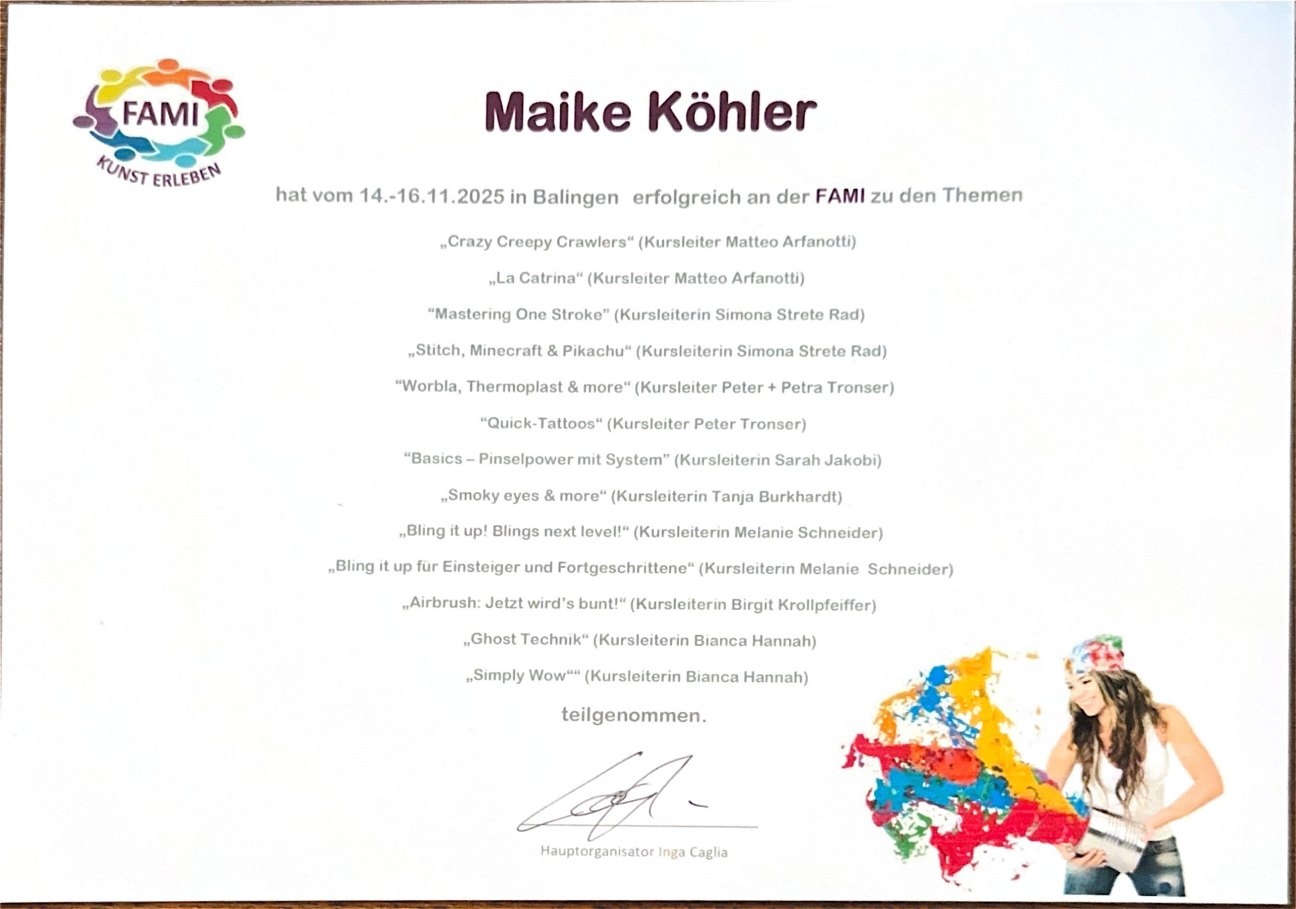 Durch mehrere Kinderschminkkurse, darunter auch bei Sparkling Faces in Liechtenstein, konnte ich meine Fähigkeiten innerhalb kurzer Zeit deutlich verbessern. Mittlerweile investiere ich viele Stunden in die Entwicklung neuer Ideen und Motive, um den Kindern ein Lächeln ins Gesicht zu zaubern. Zudem strebe ich kontinuierlich danach, mich weiterzubilden.